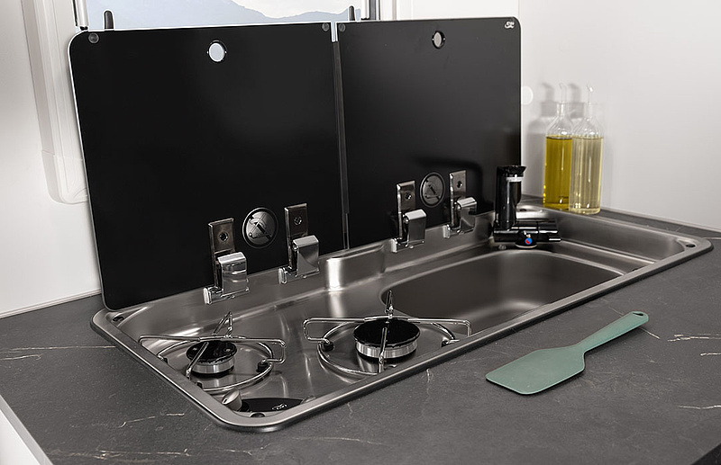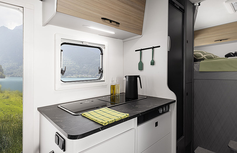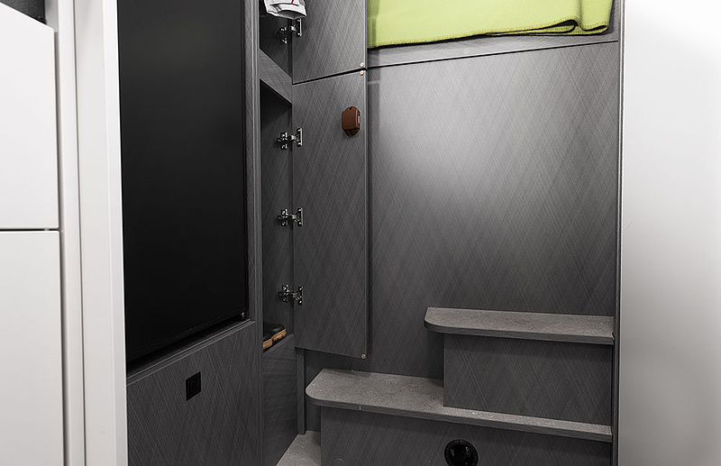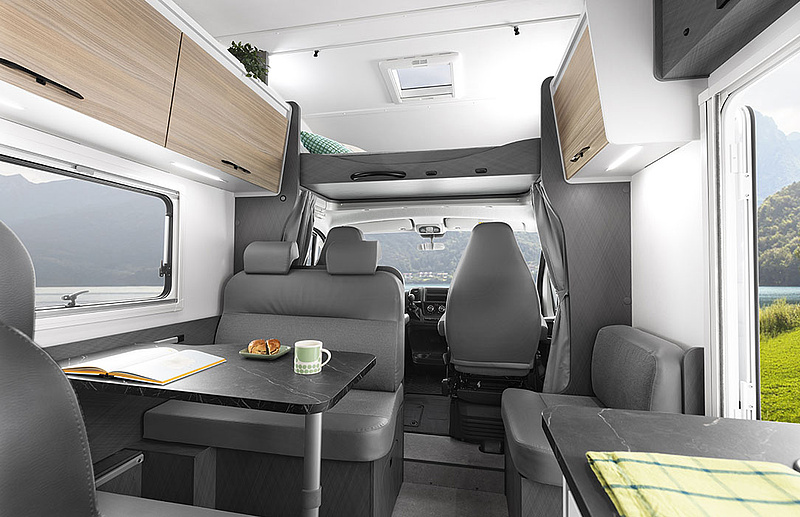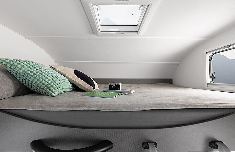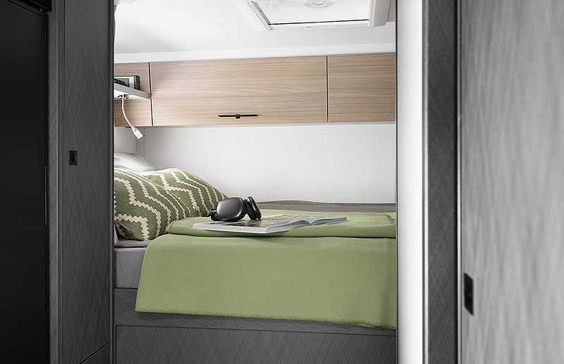 Gemütliche Betten im Heckbereich sowie das innovative Vario-Bad - ein Raum in Raum Konzept - sorgen im Alkoven für einen entspannten Tagesstart ohne Gedränge. Hier hat jeder ausreichend Platz für etwas Selfcare, bevor ein neuer, aufregender Tag beginnt.