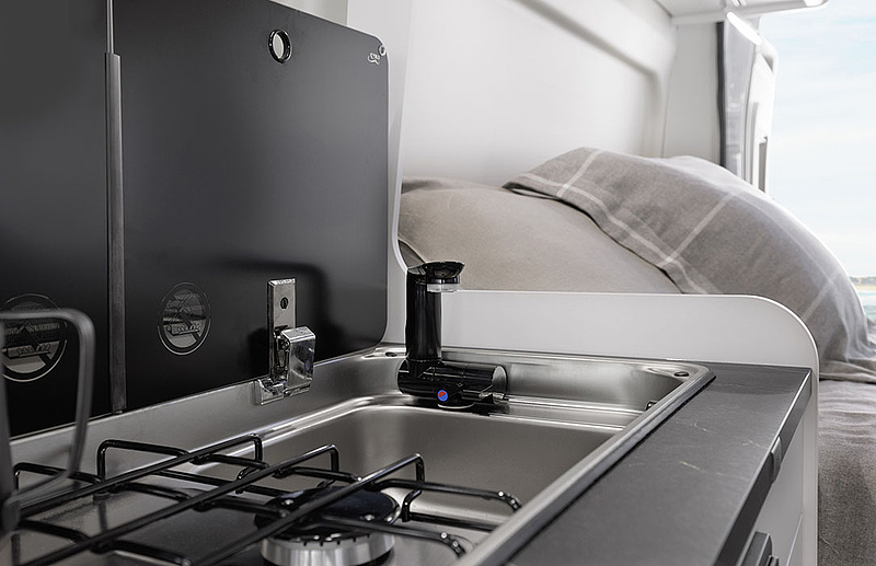 Der Camper Van besticht durch Design und Komfort. Zwei Dachfenster (70 x 50 cm im Wohnbereich und 40 x 40 cm im Heckbereich) verleihen dem gesamten Wohnmobil ausreichende Helligkeit. Maximalen Komfort im Wohnraum bietet auch die Sitzgruppe durch verstellbare Kopfstützen und ergonomische Kissen mit abnehmbaren Bezügen.