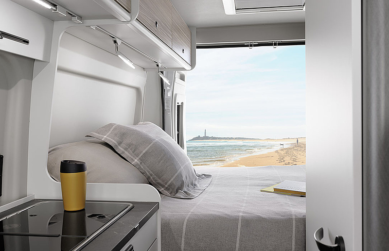 Viel Platz für erholsamen Schlaf. Die komfortablen Heckbetten sind mit Lattenrost und Premium-Matratzen mit atmungsaktiven Überzügen ausgestattet. Durch zwei verstellbare Leselampen entsteht eine gemütliche und kuschelige Atmosphäre. Mit der Dachluke mit Moskitonetz ist auch für Belüftung gesorgt.