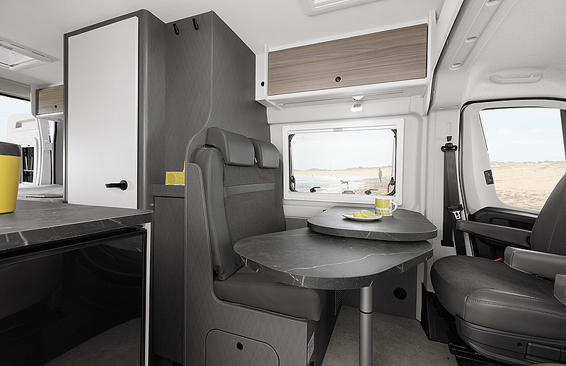Hochkomfortable Fahrerhaussessel mit zwei Armlehnen im selben Bezugsstoff wie die Polsterung im Wohnbereich fügen sich harmonisch ins freundliche Gesamtbild des Camper Vans. Am Bord-Control-Panel lässt sich das Wohnmobil einfach bedienen und lässt Sie unterwegs und im Urlaub entspannen.