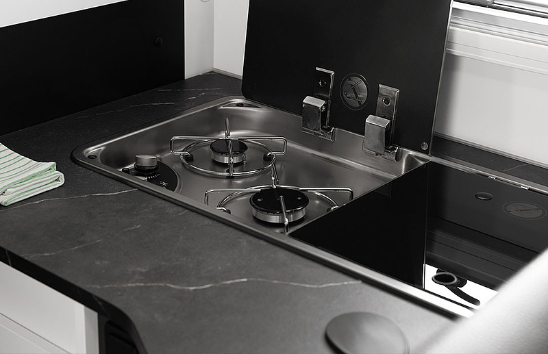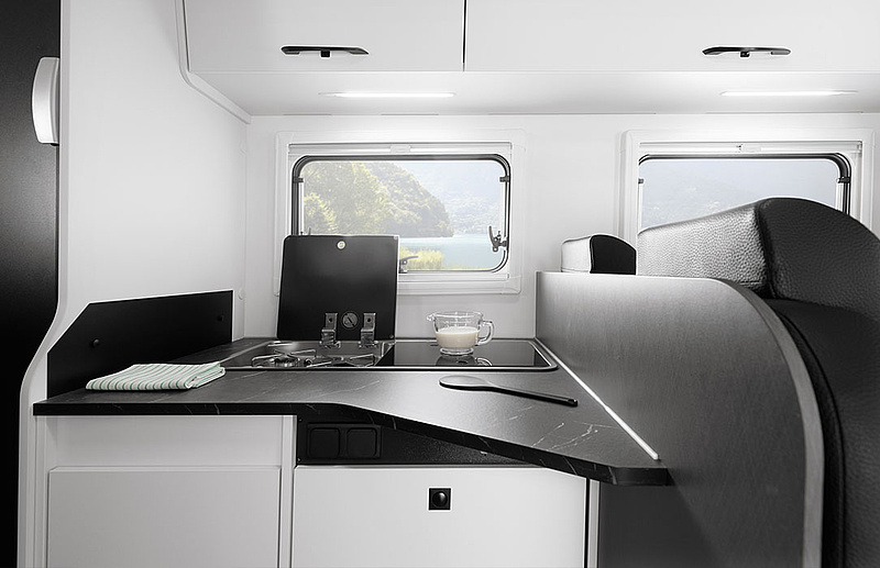 Reise-Freiheit braucht Raum. Dank clever konzipiertem Wohnraum und durchdachter Design-Pieces verleiht die offene Formensprache des T-Modells Base einen frischen Touch in cosy-comfort. Perfekte Symbiose aus Funktionalität und Stil. Auch die Küchen-Zeile ist praktisch ausgestattet. Im XXL-Kühlschrank haben Sie alles dabei, um spontan eine Koch-Show zu starten. Beim Sonnenuntergang auf dem Campingplatz dinieren – das ist echte Outdoor-Romantik.