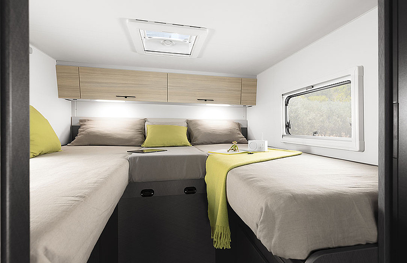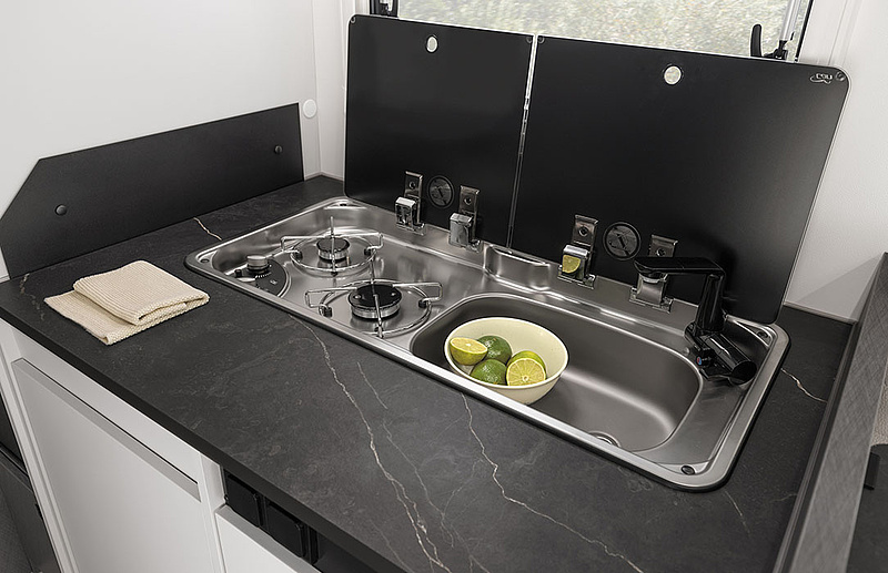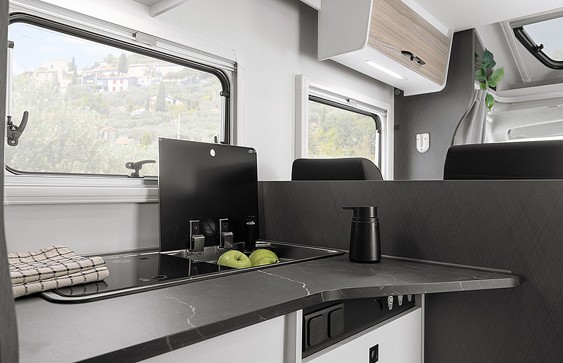 Reise-Freiheit braucht Raum. Dank clever konzipiertem Wohnraum und durchdachter Design-Pieces verleiht die offene Formensprache des T-Modells Base einen frischen Touch in cosy-comfort. Perfekte Symbiose aus Funktionalität und Stil. Auch die Küchen-Zeile ist praktisch ausgestattet. Im XXL-Kühlschrank haben Sie alles dabei, um spontan eine Koch-Show zu starten. Beim Sonnenuntergang auf dem Campingplatz dinieren – das ist echte Outdoor-Romantik.